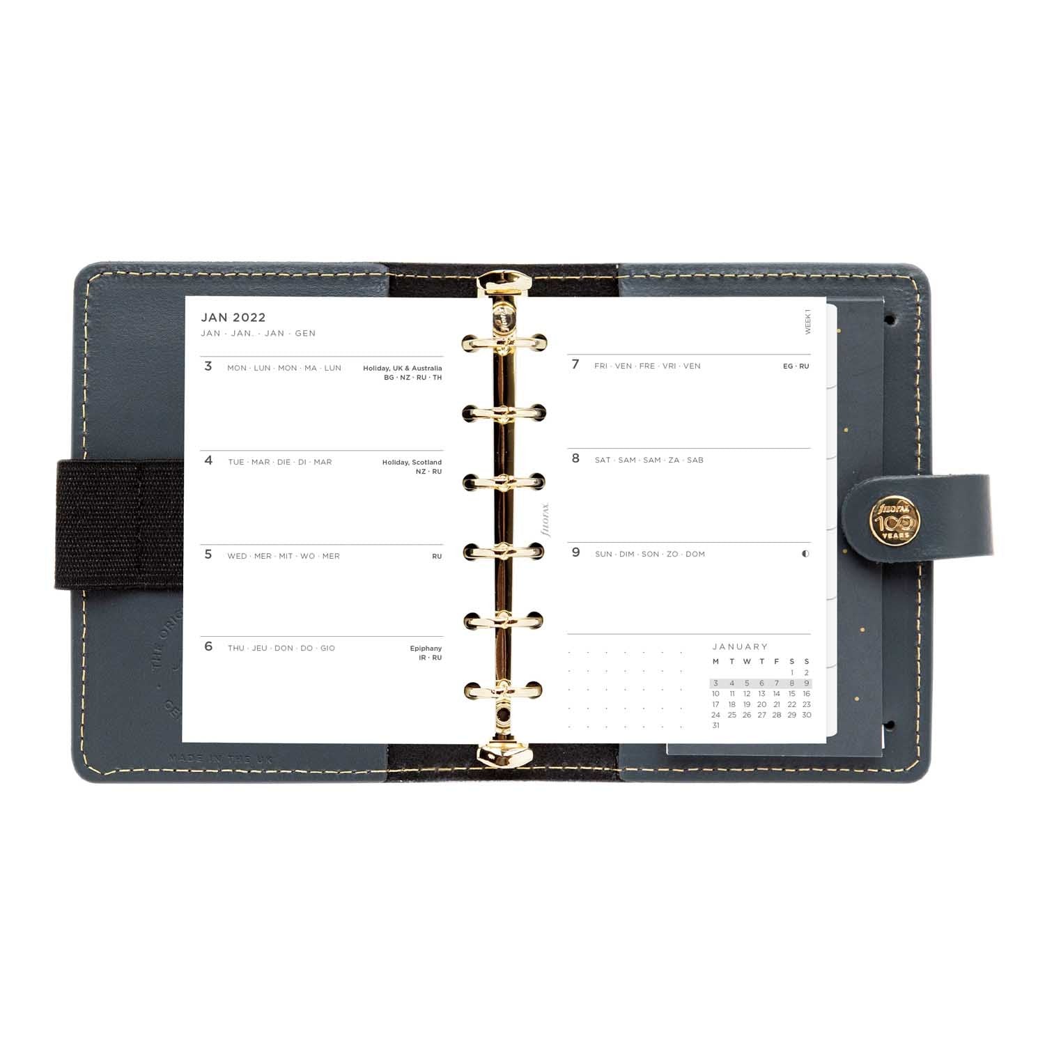 The Filofax Limited Edition 2024 Centennial Pocket Size Original Genuine Leather Organizer is hand crafted in Great Britain. In celebration of their 100-year anniversary and inspired by the first ring organizer created by Filofax in 1921. Featuring a new dated refill in a clean, minimal layout designed with the contemporary user in mind, these organizers include considered details such as gold rings, gold stitching and a special popper cap.